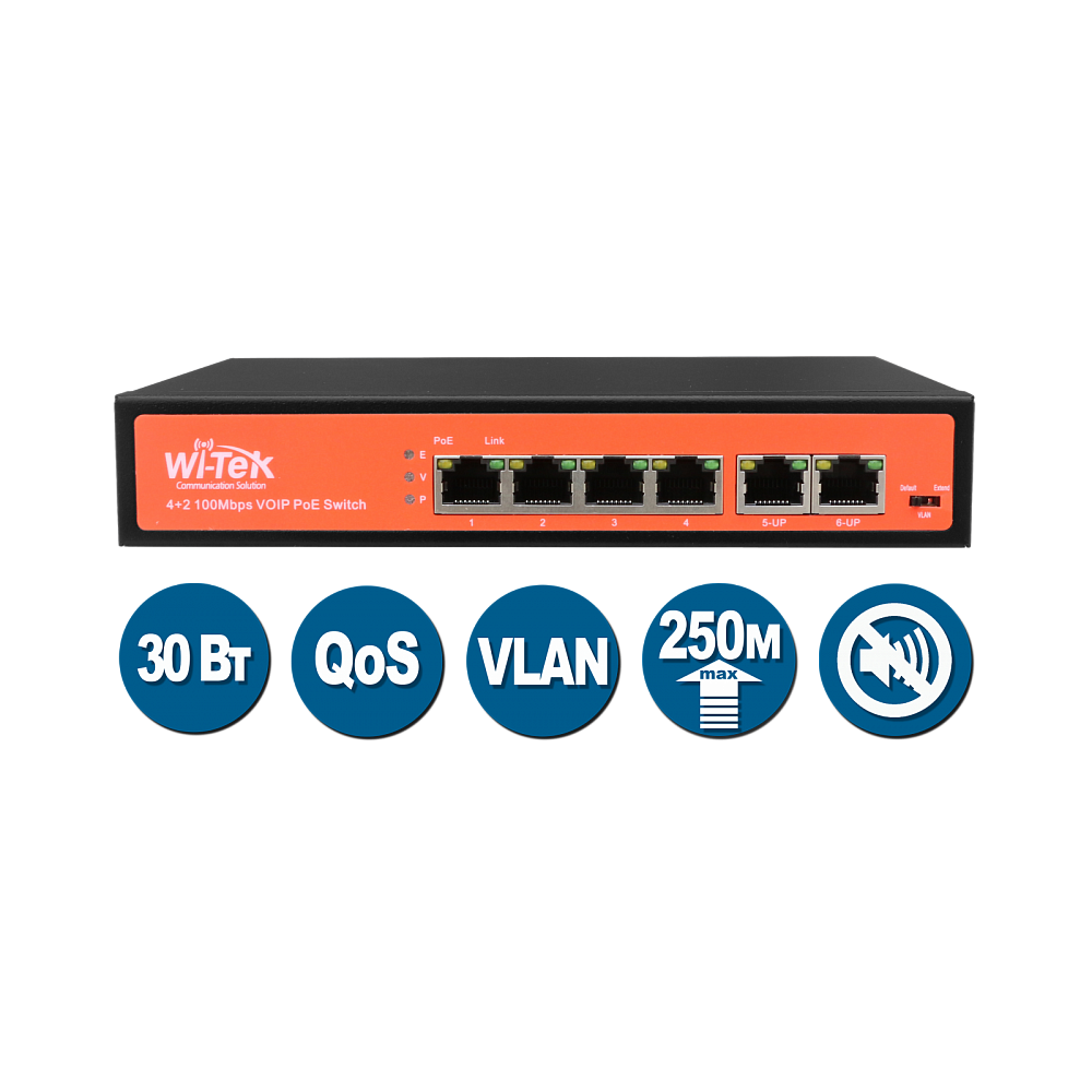 Коммутатор оснащен 6 портами 100Base-TX, из которых 4 поддерживают 802.3af/at (PoE, PoE+) 30 Вт.